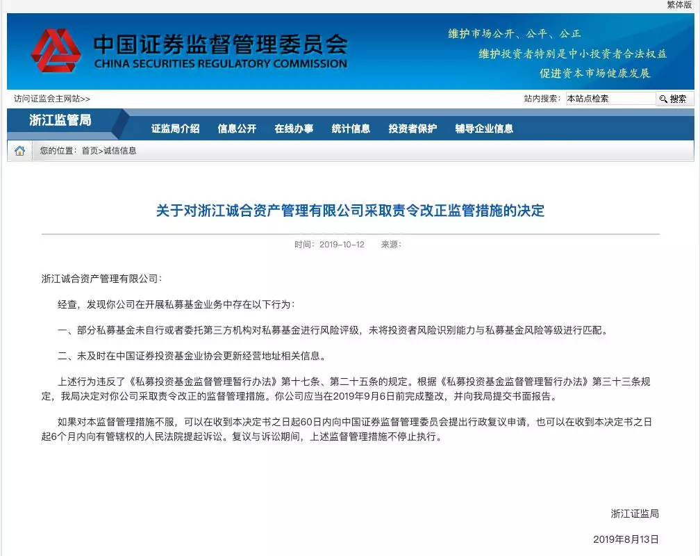 2019年10月12日,证监会浙江监管局发布了8月13日对浙江诚合资产管理有限公司采取责令改正监管措施的决定。该决定称浙江诚合资产管理有限公司存在部分私募基金未自行或者委托第三方机构对私募基金进行风险评级,未将投资者风险识别能力与私募基金风险等级进行匹配以及未及时在中国证券投资基金业协会更新经营地址相关信息的行为,要求浙江诚合资产管理有限公司于9月6日前完成整改,并向证监会浙江监管局提交书面报告。